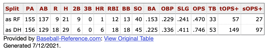 This is the cumulative bWAR for Royals’ right fielders. It’s the worst bWAR for that position in all of baseball. The next closest is the Pirates right fielders at -1.8 bWAR.