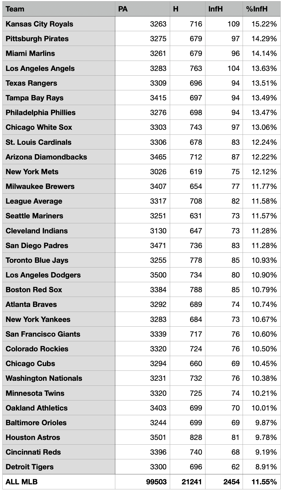 Although it should be noted the team with the lowest percentage of infield hits—Detroit—is only minimally better at scoring runs than the Royals. Carry on.