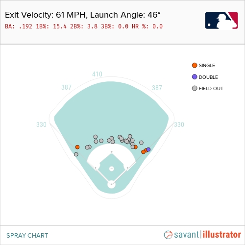 And that one run? Just to prove that baseball is the cruelest sport, it came on a doinker down the left field line just out of reach of Royals’ third baseman Emmanuel Rivera. It had an exit velocity of 61 MPH and a launch angle of 46 degrees. According to Baseball Savant, batted balls with that profile have an expected batting average of .160. This is where those batted balls land.