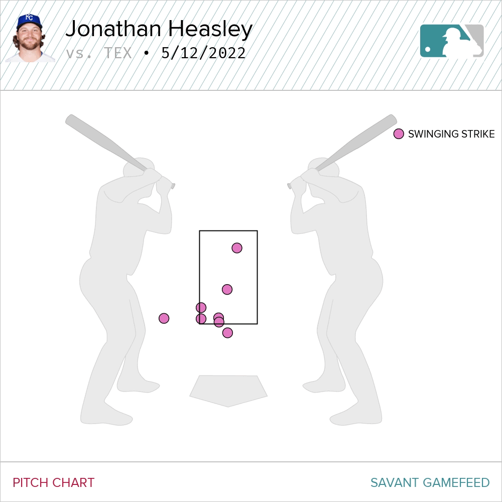 Lucky bloops and suspect command aside, Heasley worked primarily changeup and four-seam, with a curve and sinker thrown in for a little variety. The change is an above-average offering for him and it wasn’t difficult to see why. He threw 37 of them to the Rangers (46 percent of all pitches) and generated eight whiffs.