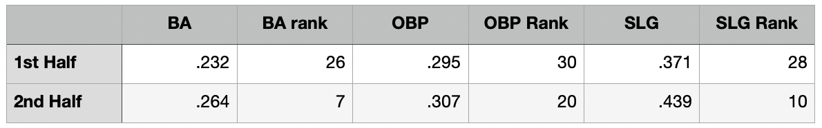 I admit to being dismissive of the company line that often comes from One Royal Way when there is some sort of improvement or notable statistic that paints the club in a favorable light. However, in this instance, I think they may be underselling the offensive turnaround. Since the All-Star break…A 32-point improvement in batting average? A 12-point boost in on-base percentage? A freaking 68-point improvement in slugging? This is an amazing turnaround from their first-half production. Stunning, really.