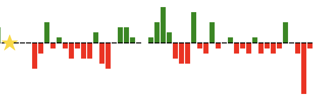 Worth noting is that, Saturday’s debacle in Seattle notwithstanding, the Royals have been playing a lot of close games. Most of their losses this month have been by a two or one-run margin. This is how their games by margin of victory or defeat looks since the All-Star break as visualized by Baseball-Reference: