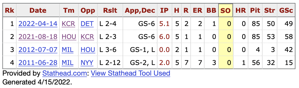 I also like that his previous start with no strikeouts was against the Royals.