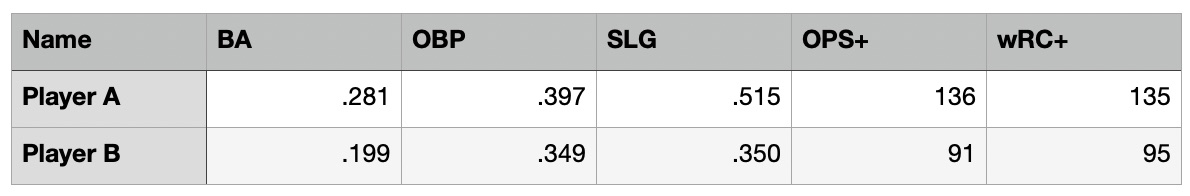Let’s look at a couple of stat lines; a compare and contrast sort of thing. Can you guess the players?