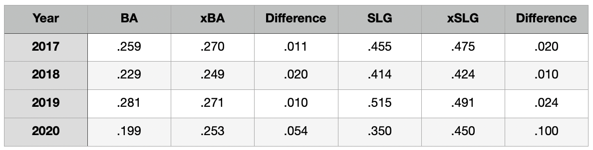 Then there are his expected rates from Savant. You can see from the table below his Expected Batting Average (xBA) outpaces his actual BA by about 0.014 on average. His Expected Slugging Percentage (xSLG) leads his actual slugging percentage by about .018. The differences in 2020 were…substantial.