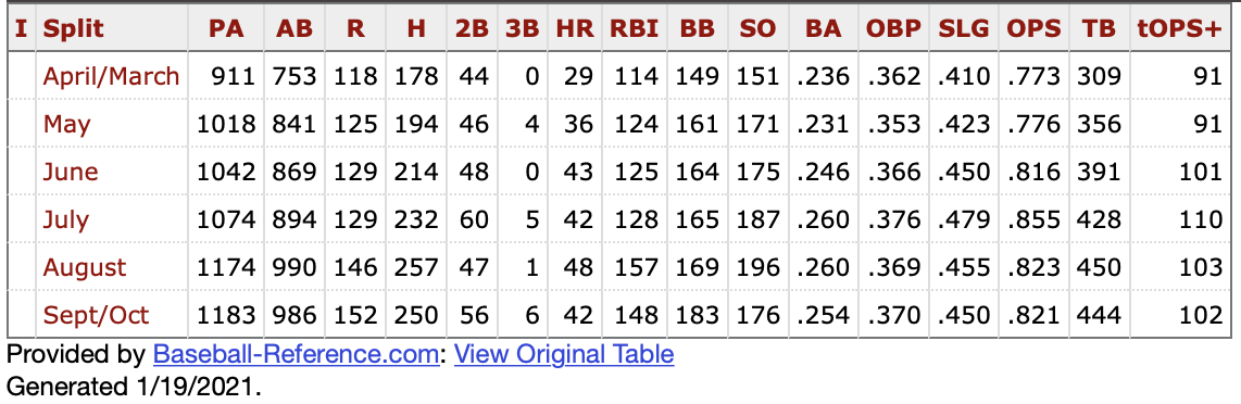 There are enough plate appearances (over 1,000 in every month but April) that this is quite informative. Santana’s power doesn’t truly get going until the weather warms up. Same for his on-base percentage. The tOPS+ tells the real story. That’s the split relative for Santana’s total OPS+. That’s not measuring him against the league like OPS+, that’s measuring him against himself. And that shows he’s generally nine percent below his typical production in the first two months of the season.