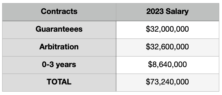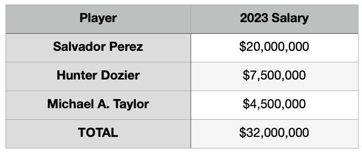 We can’t forget Bobby Witt Jr., Vinnie Pasquantino, Edward Olivares, Daniel Lynch and any of the other Baby Royals. Next year the MLB minimum salary will be $720,000. (Along with bump for the top 100 in WAR who will split a pool of money per the latest collective bargaining agreement.) With 12 spots on the roster yet to be spoken for, the assumption (for now) is all will go to the younger players. That’s an additional $8.64 million at least.