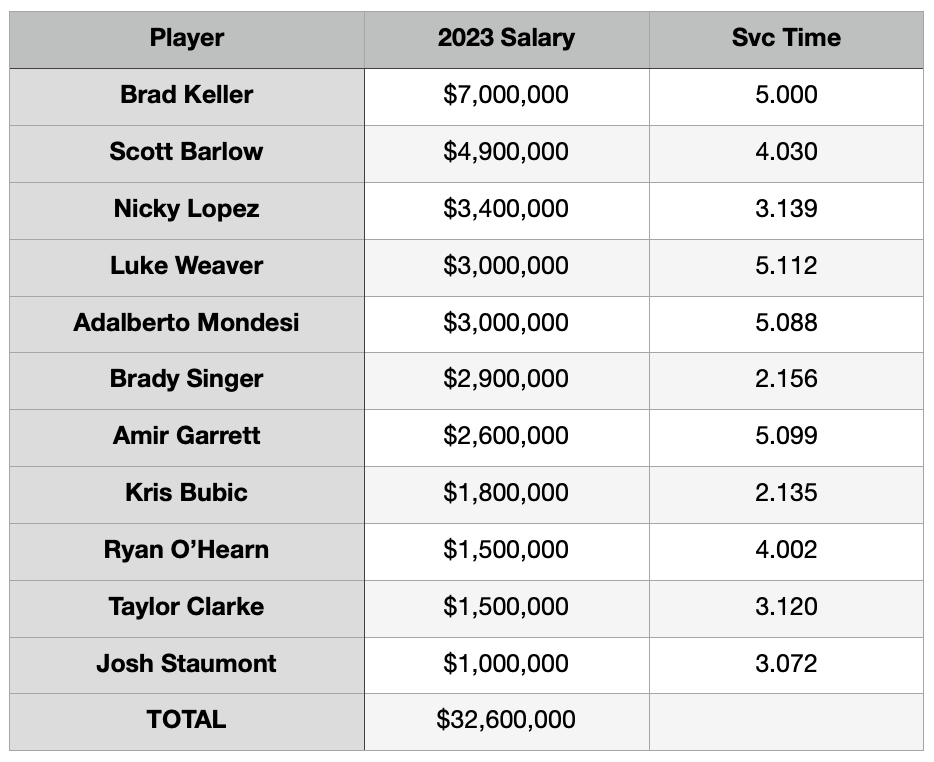 Here is the list of Royals players who are eligible for arbitration, along with their estimated salary for 203 and service time following the completion of 2022. The service time, as you will see in a moment, is massively important.