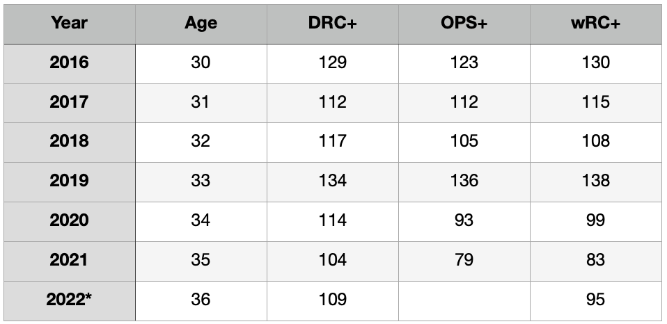 Santana will be playing in his age 36 season in 2022. Here’s how he’s done according to DRC+ since he turned 30.