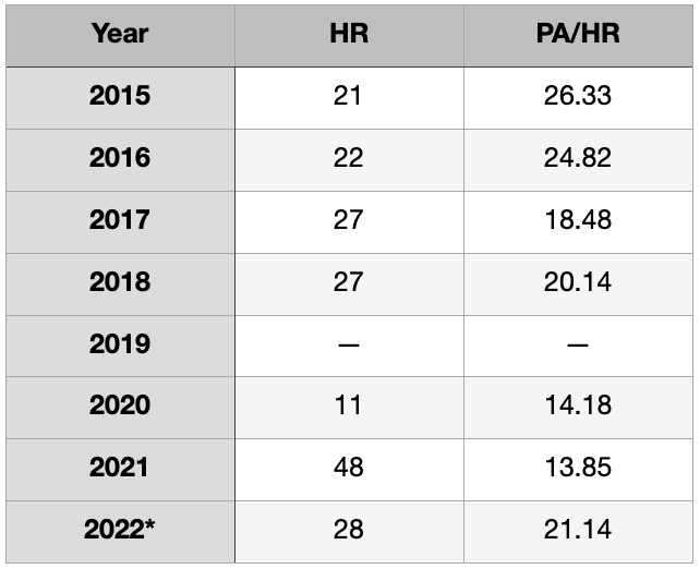 It’s probably unrealistic to expect Perez to improve on his home runs per plate appearance rate like he did in 2021. However, it seems unlikely (i.e. if he’s healthy for the entire season, or as healthy as a regular catcher can be) that he would tumble like the above projection.