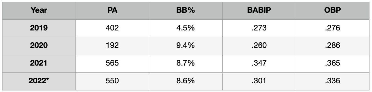 But here’s the deal. BABIP doesn’t stabilize for hitters until they have 800 batted ball events. Lopez, with 901 balls put in play for his career, just crossed that threshold. So based on his first three seasons in the majors, we can say with a decent degree of confidence that Lopez will should post a BABIP of at least around .305 to .310. Unless…his dramatic shift in approach means we should throw out his first two seasons of data. He was clearly a different hitter in 2021 than we had seen in his previous two seasons. Is that sticky? Can we expect him to reap continued improved numbers based on this?