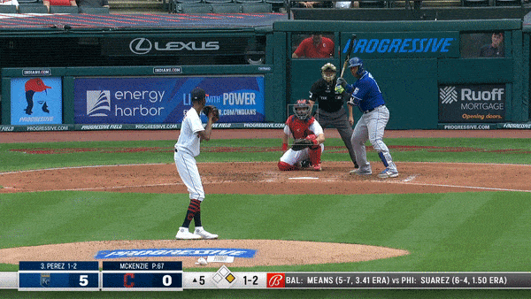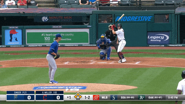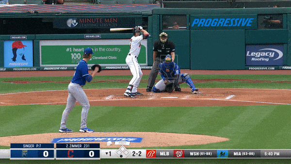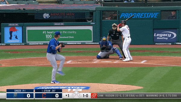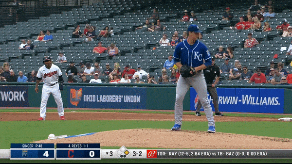 While it looked like Singer had both pitches working from the beginning, the first inning was a bit rocky. He allowed two singles, a walk and hit a batter. But he got two strikeouts (including the one above) and had Salvador Perez gun down Myles Straw attempting to swipe second. The fact Singer was able to navigate early danger, was also a reason for early optimism. How many times have we seen a Singer start go off the rails behind a walk or a bloop single? Feels like too many to count. Who wants to count those anyway?
