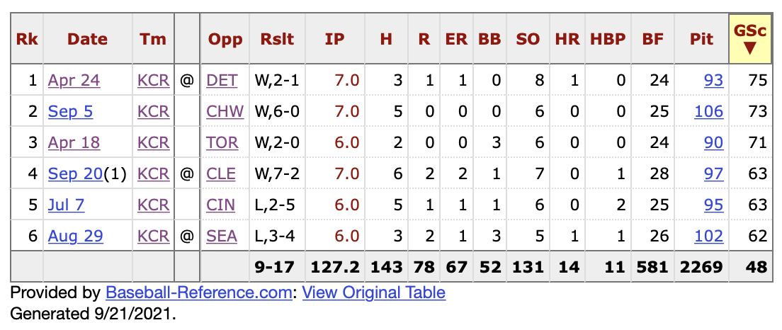 Sorry…back to Monday. Singer wrapped with a Game Score of 63, making it tied for the third-best start of his 2021 and just the sixth time he’s topped 60 this season.