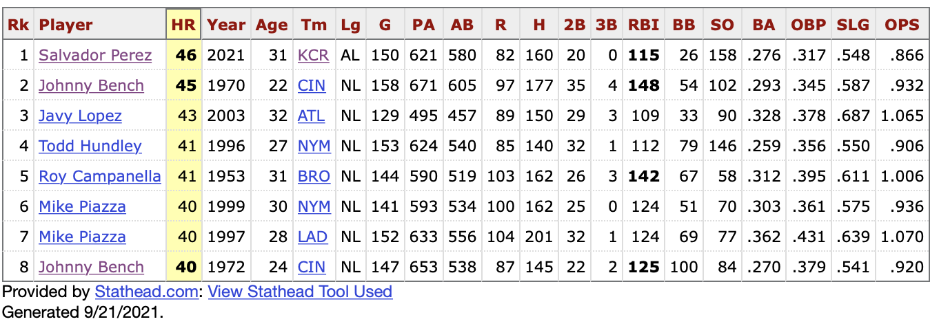 This is how the list now looks among catchers who hit more than 40 bombs in a season.