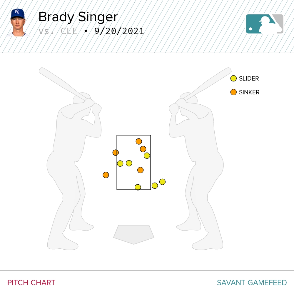 Of his 97 pitches, Singer threw 51 sinkers and 43 sliders. He generated a 30 percent CSW% (Called Strikes + Whiffs) on those two pitches, which is a fine rate. He didn’t get a lot of swings and misses on chase pitches, but that just underscores how both pitches were keeping Cleveland batters off balance.