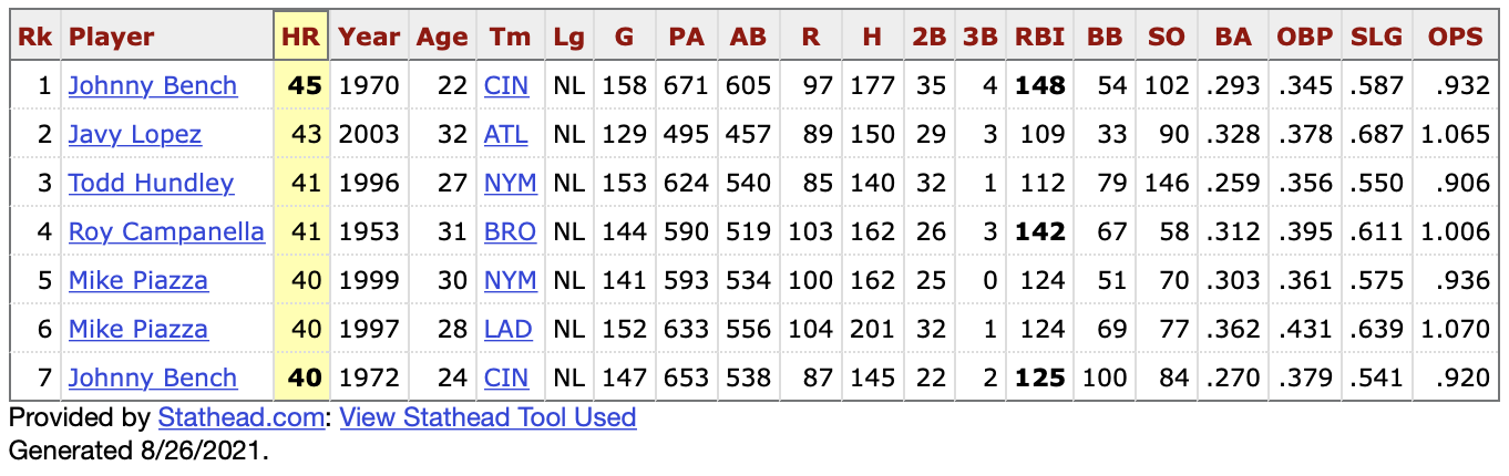 In the history of the game, there have been seven 40-homer seasons by a catcher.