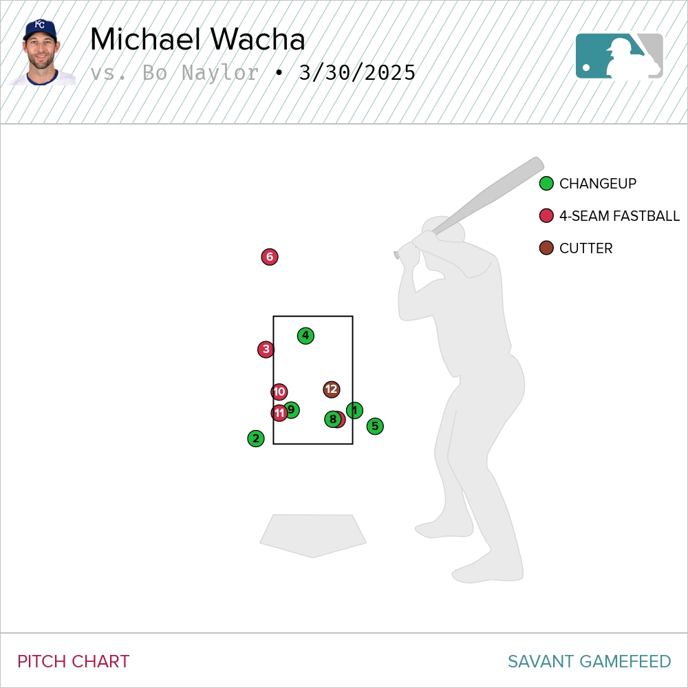 Wacha walked the next batter to put runners at first and second, but recorded his first out. The problem was, to this point he needed 40 pitches to get to that point in the game. To compound the pitch count issues, the next batter, Bo Naylor, had this plate appearance: