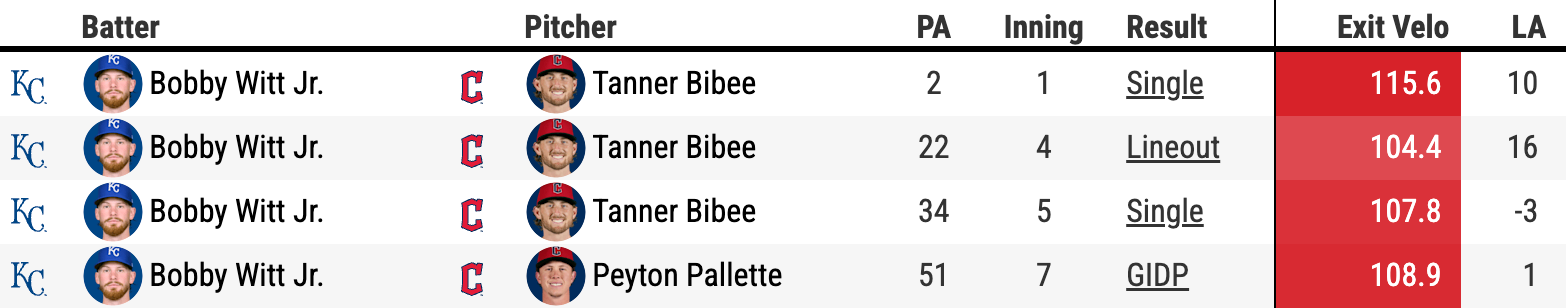 Speaking of Witt and getting right, I'm aware of the "what's wrong with Bob?" rumblings that come with the type of slow start we're seeing again from the Royals perennial MVP candidate. He went 2-4 on Monday with his first hit a single at a blistering 115.6 mph off the bat on a center-cut sinker.