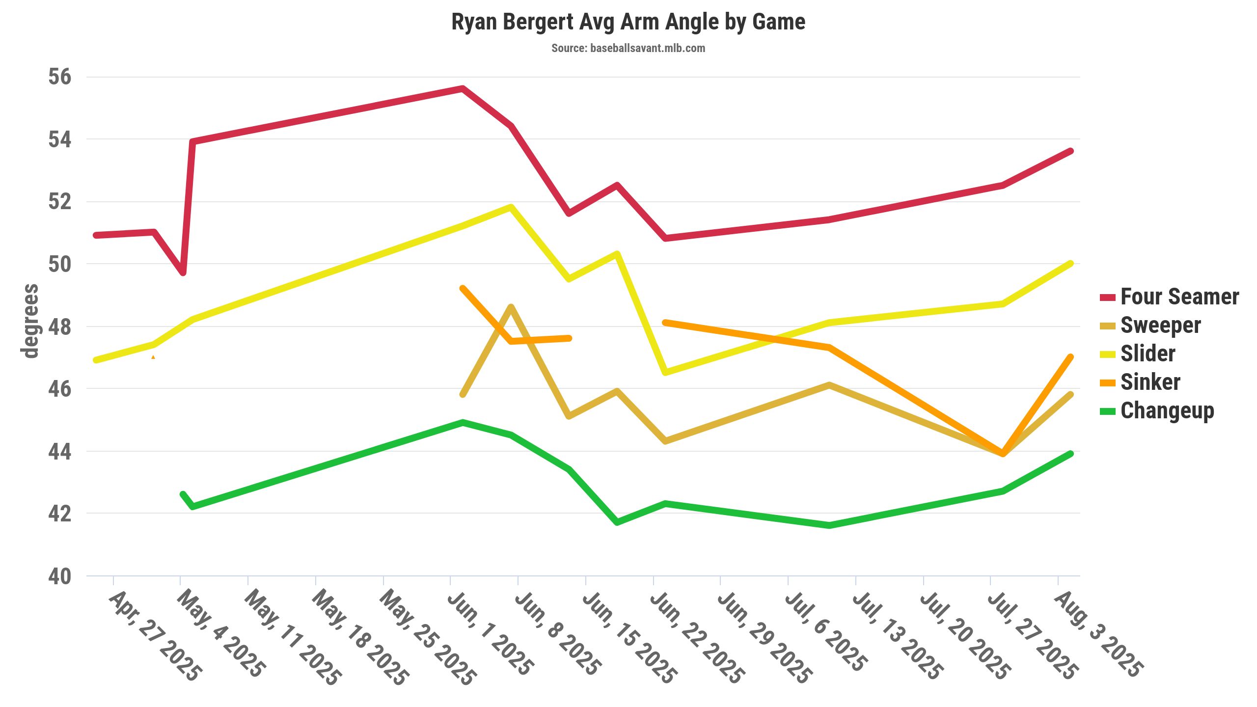 Honestly, it looks as if Bergert is trying to find the slots that work for him. There’s a wide gap between different pitches and their respective arm slots—about 10 degrees from highest to lowest. Seth Lugo by comparison runs a difference of about five degrees. His slow curve excepted. Also, for Bergert, there’s a lot of inconsistency. Remember that he starting pitching for San Diego out of the bullpen, making his first start for the Padres on June 3.