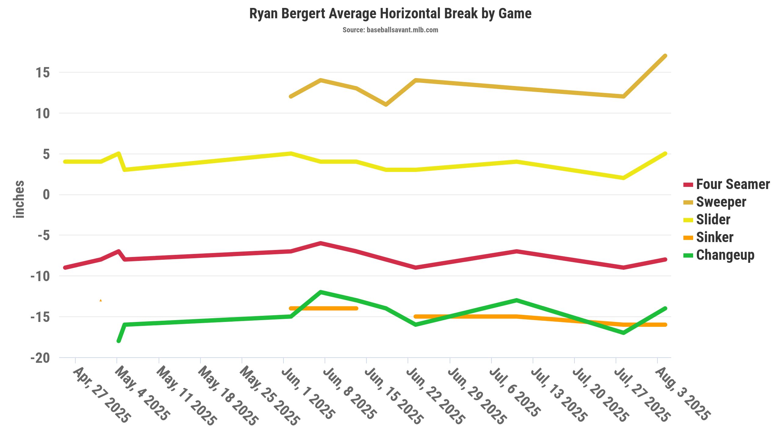 Prevously, the Bergert sweeper was averaging around 13 inches or so of glove-side run. Good movement, but hardly elite. On Tuesday, though, he found on average around 17 inches of glove-side run, routinely touching 19 to 20 inches. This is what 20 inches of glove-side run looks like.