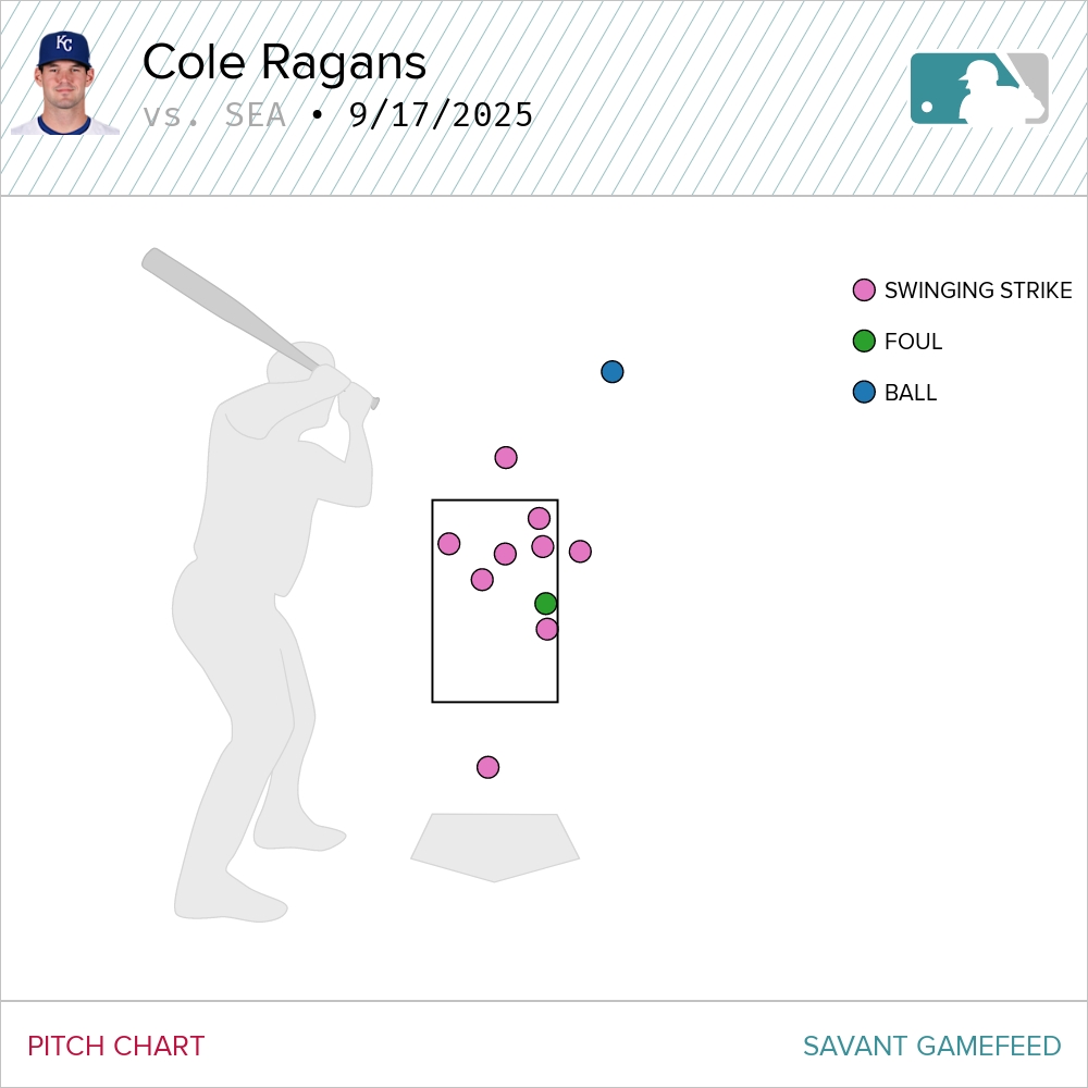 Let’s begin with Ragans because his first inning was straight-up insane. The lefty came back throwing fire. Literally. Ragans touched 98 mph in the first inning and averaged around 97 mph with a four-seamer he delivered 10 times. He recorded one foul ball on the pitch…and nine whiffs. Nine whiffs!