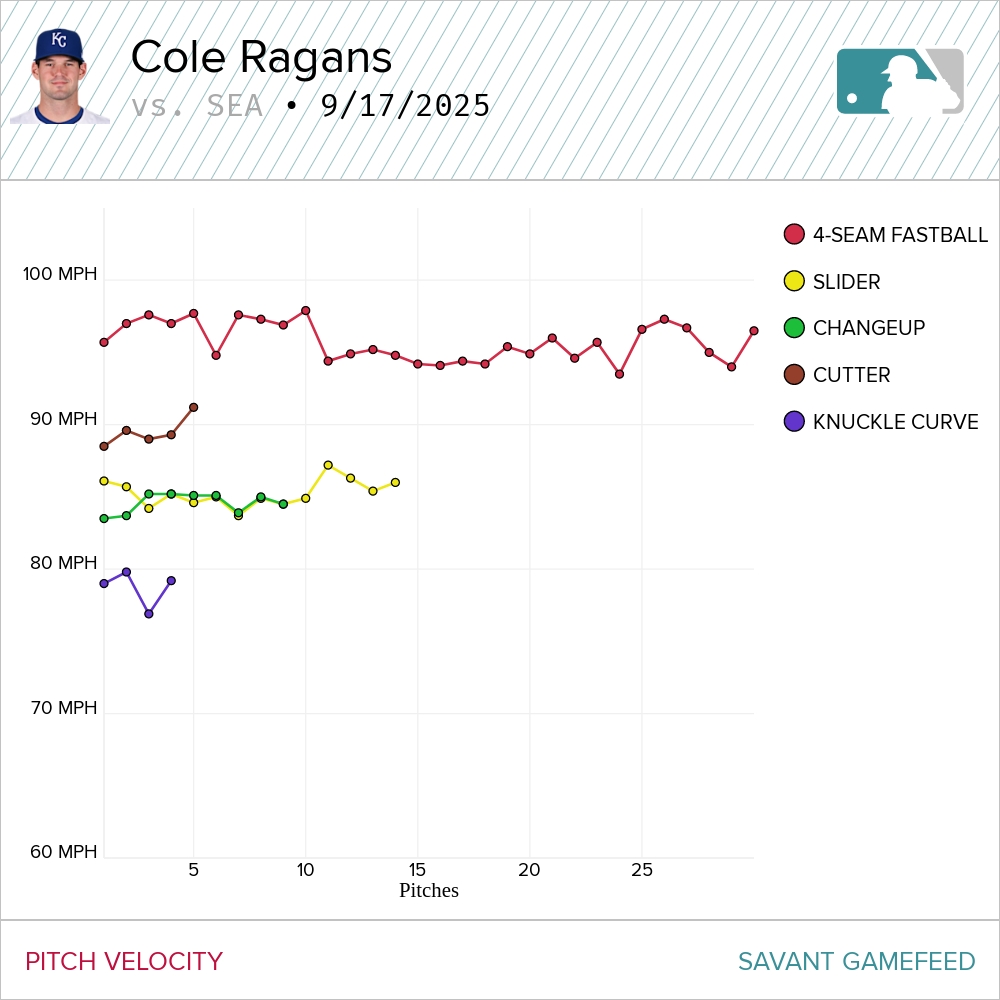 Ragans lost a bit of velocity between the first and second innings. After living around 97 mph in the first, he settled into the mid-90s in the second frame. Looking at his velocity chart, it’s obvious when the second inning started.