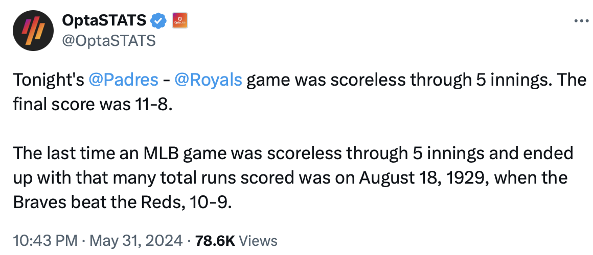 The challenge for Ragans was navigating the sixth as the Padres would be sending the heart of their order up for the third time against the Royals ace lefty. Except one of the things that have made Ragans so good, especially this year, is how he gets stronger as the game unfolds. This year, opposing batters are hitting just .207/.303/.278 against Ragans when they see him for a third time. That’s good for an OPS+ of 58. Damn, that’s impressive.