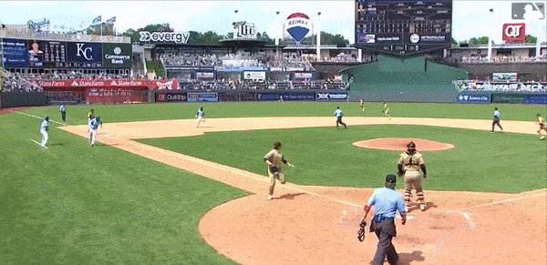 This is insanity. We all know The K leads the league in outfield acreage, but that’s not normally a place where triples are hit. Not unless you’re Bobby Witt Jr. This is where we need to give Velázquez a ton of credit. He was busting it out of the box. Watch this GIF for how he motors to second and never breaks stride before wheeling it to third. This is a dude who was thinking triple out of the box. I repeat: He was thinking triple out of the box.