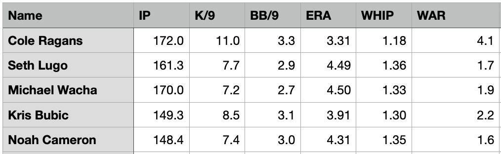 I’ll include some projections here for my rotation from Steamer, via FanGraphs. I chose Steamer over ZiPS because Steamer has a more optimistic view of playing time, projecting between 29 and 25 starts for the rotation. In turn, that gives a rosier fWAR projection. Steamer projects the Royals rotation (at least based on the guys I have in the rotation at the moment) for a total of 11.5 fWAR. That’s slightly above average from where the numbers netted out for the 2025 season, and it’s off the mark from where this rotation finished. In 2025, Royals starters combined for a 13.8 fWAR.