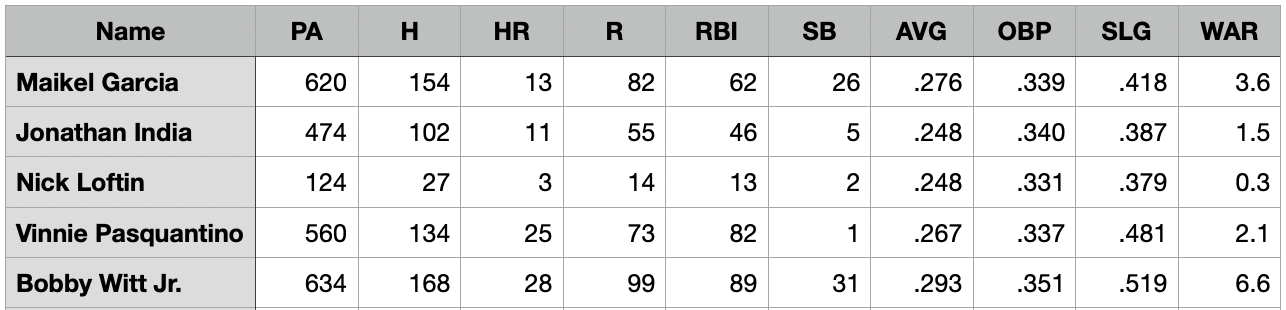 A .340 OBP for India isn't among his best seasons, but it's still plenty better than he posted last year for the Royals. That would play in the leadoff role ahead of Witt. Speaking of Witt, just another ho-hum season projected. Those numbers feel low. All of them.