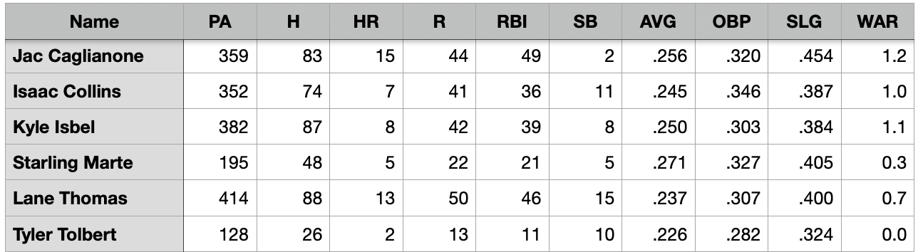What stands out for me in this projection group is that, as I was sorting the spreadsheet, the performance from the outfielders were all well below the gang on the dirt. While the Caglianone projection is low, I'm not sure Steamer isn't spot-on for the rest of this crew.