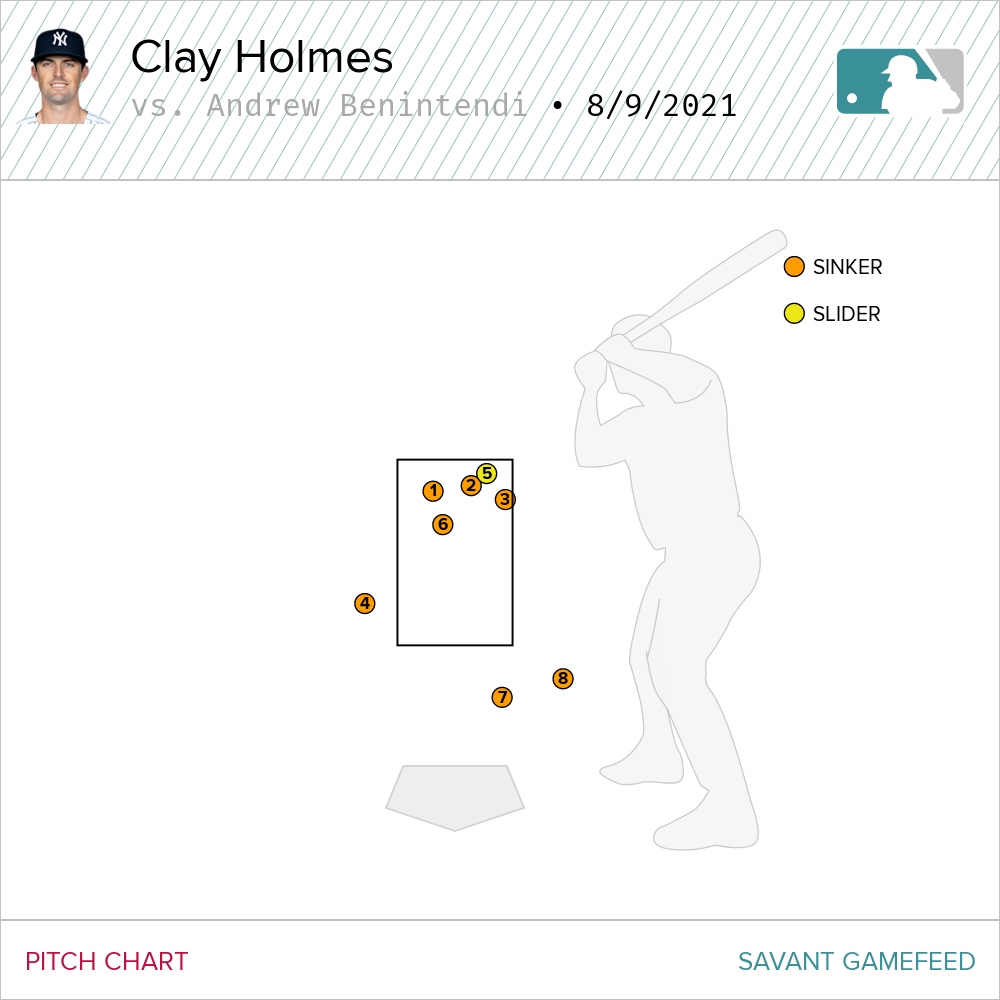 I also wanted to point out the plate appearance from Andrew Benintendi in the bottom of the 10th. Clay Holmes fed him a steady diet of sinkers in the mid-90s. Down 1-2, he spun the only slider of the PA. It froze Benintendi and the home plate umpire as well. From there, Benintendi fouled off another pitch and watched two more sail out of the zone.