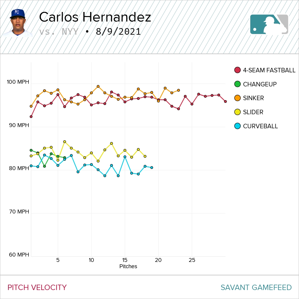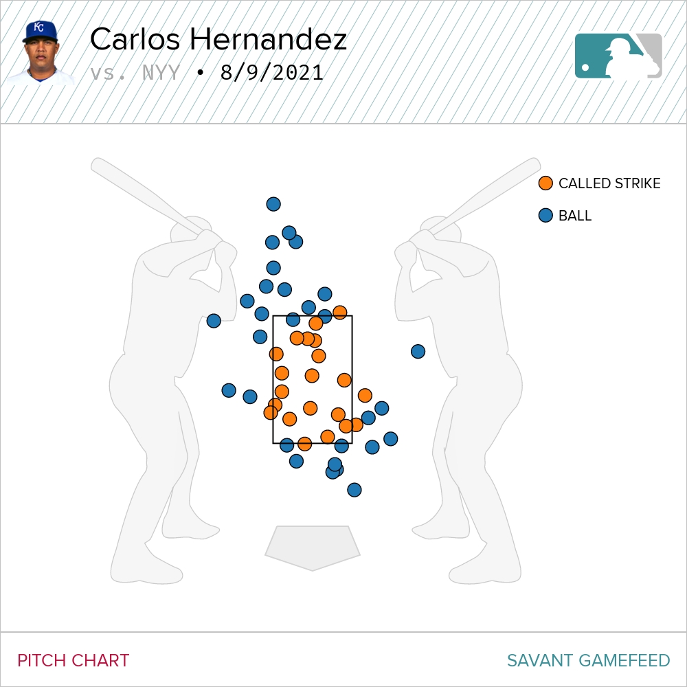 Hernández was peppering the edges, got a little squeezed on the upper and lower boundaries and it was honestly surprising the Yankee hitters were able to lay off some of those close pitches. He gets wild high from time to time but was able to harness that energy that will lead to an occasional overthrow of a pitch and get subsequent pitches in and around the zone.