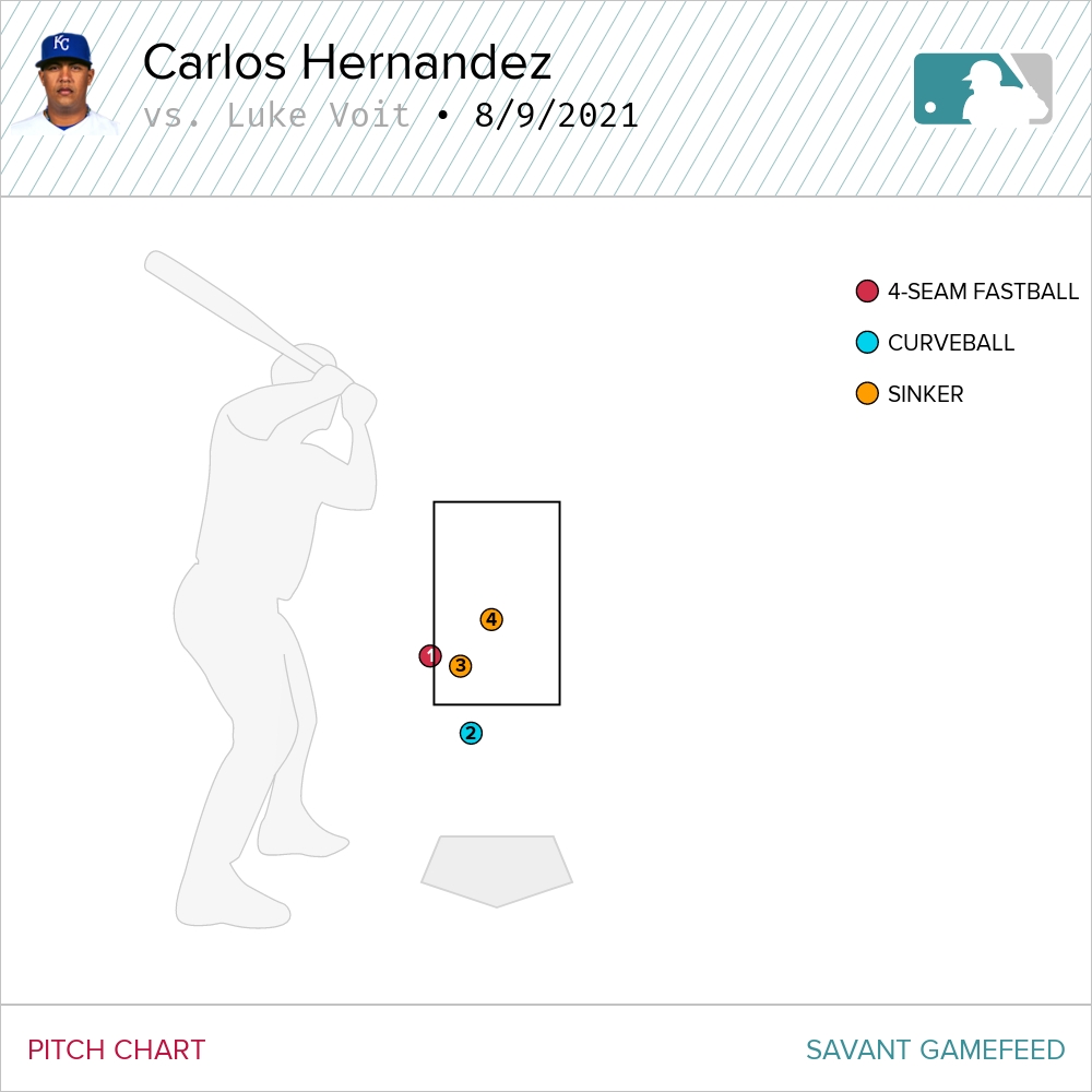 Sadly, Voit was able to turn on the next pitch to drive home a run: a center-cut 1-2 slider. The first three pitches in that at bat were on the inner half. It looked like Cam Gallagher was looking for a pitch well inside again. Hernández just missed his spot.