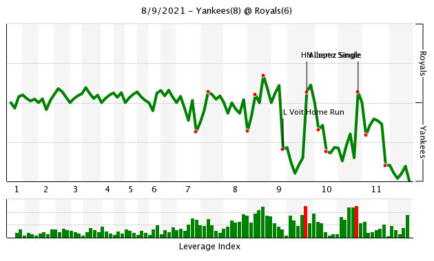 Lopez singled off Jonathan Loaisiga to ignite the rally in the eighth. He moved to second when Salvador Perez walked for the second time. (Two walks for Perez? The game was already out of control!) He was down to his final strike, just put the bat on the damn ball and completed the Royals’ third comeback of the night.