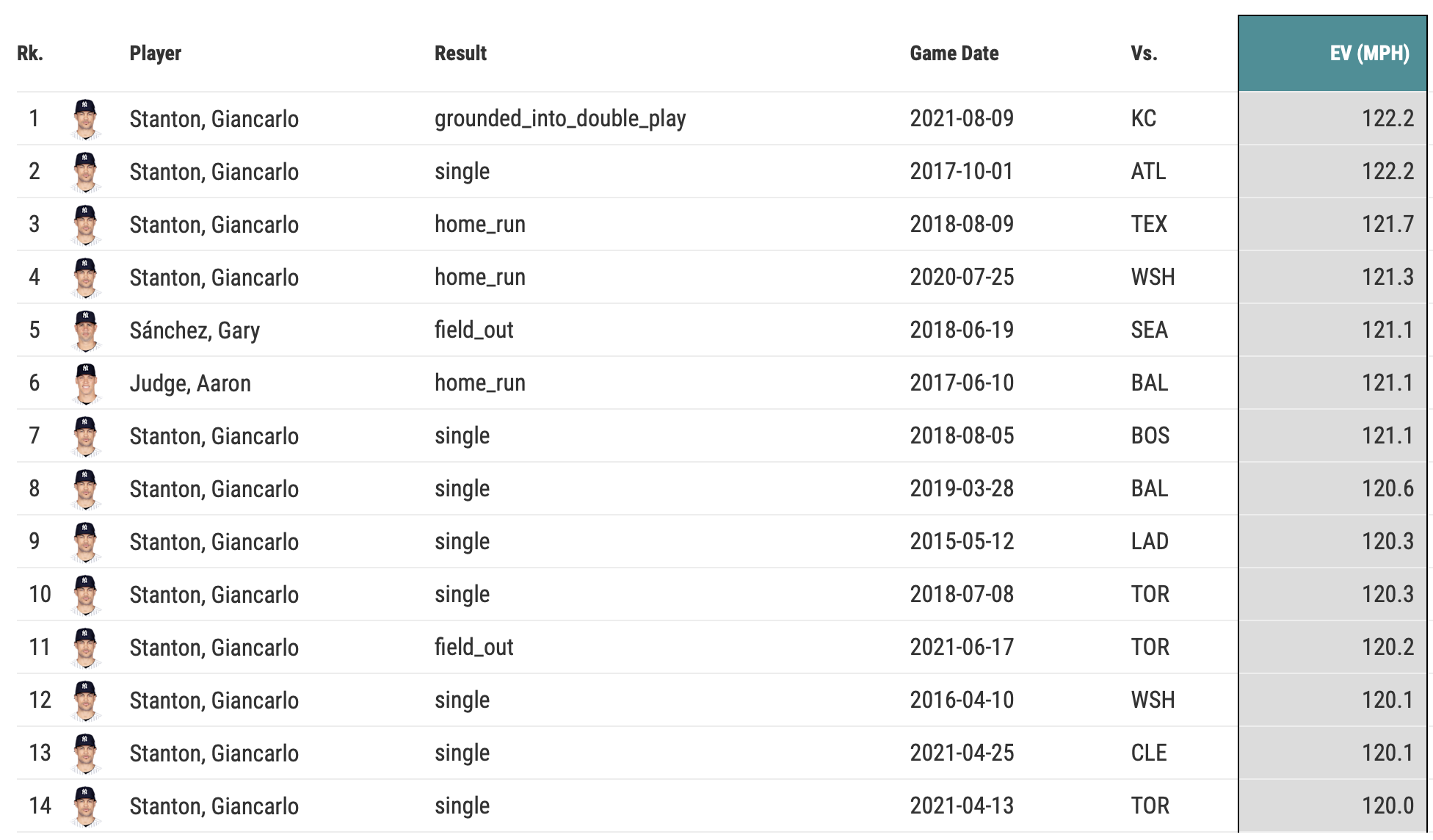 An exit velocity of 122.2 mph? Are you serious? That’s the hardest-hit ball in 2021 according to Statcast by a full 2 MPH. Just for fun (I realize this is a Royals newsletter and I’m spending a little too much time on a Stanton ball in play, but come on…) I looked up all batted balls scorched over 120 mph since Statcast started tracking.