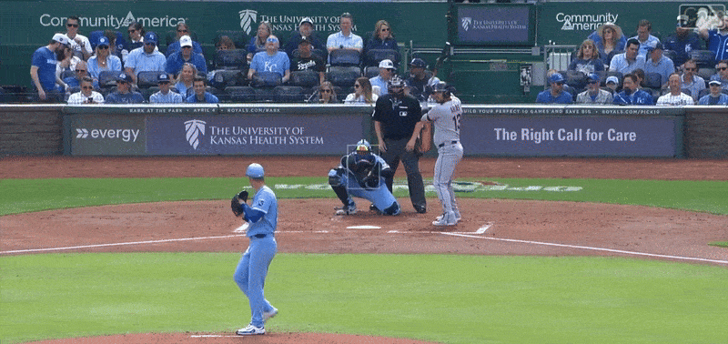 In the bottom of the eighth, the Royals were still trailing by the score of 4-3. Against setup man Hunter Gaddis, Cavan Biggio did precisely what he is supposed to do as long as he’s on this roster: Draw a walk. It was a good plate appearance, too. He fell behind 0-2 on a pair of low sliders. With a, let’s say, expansive strike zone on the day, trying to hit while behind in the count was an extremely dangerous proposition. Gaddis isn’t necessarily a strikeout pitcher, at least not by the standards set in today’s game. Last season, he whiffed just under 24 percent of all hitters he faced. What Gaddis does well, is control the zone. His walk rate of five percent last year was elite. Among 169 relievers on Fangraphs leaderboard, it was tied for the 14th-best walk rate last year.