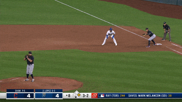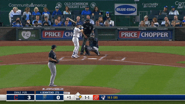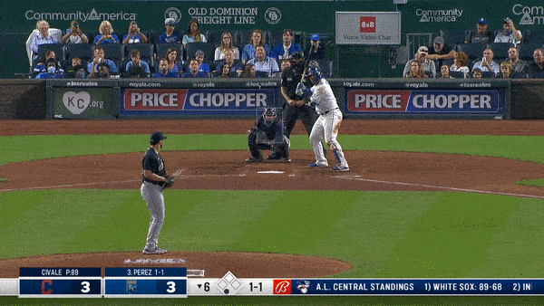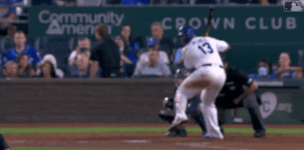 With Merrifield off and running on the 3-2 pitch, he scored easily. Lopez ends up at third on his fifth triple of the season on an elevated cutter just a bit to the outer half of the plate. I can’t stop watching this gif for the location of the pitch and what Lopez did to it. It was the perfect swing in that situation. Again…Professional Hitter.
