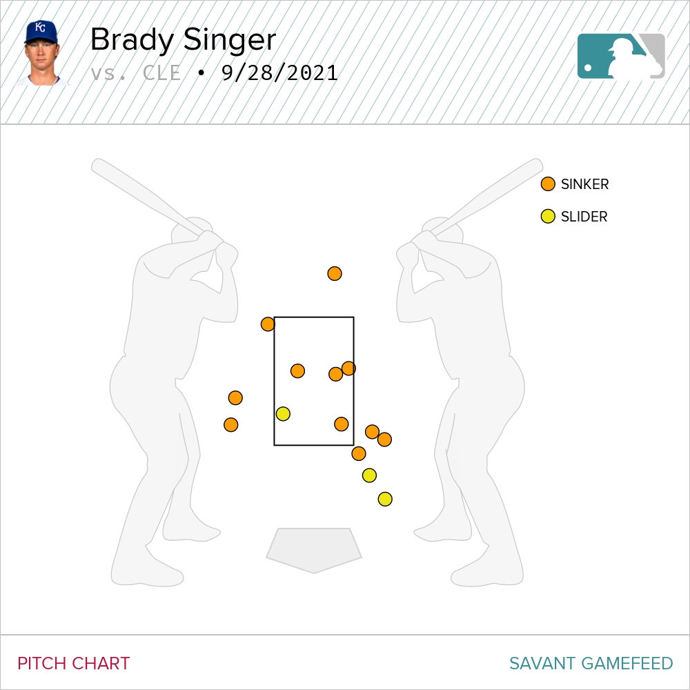 Wild that for pitches in the zone (and there were only five), four were put in play. I’ve been thinking a bit about what Kowar said in his post-game press conference on Monday about wanting to work on the edges. With his limited, two-pitch arsenal Singer needs to do that as well. He was there on a couple of offerings, but was mostly well off the plate.