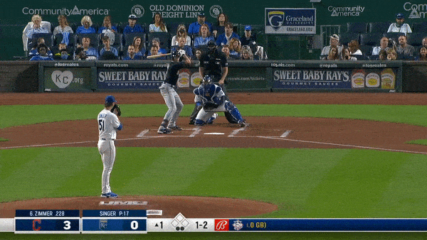 After this, Whit Merrifield motioned to the dugout that something was wrong. Perez seemed to notice as well and did the same thing. (It’s wild to me that baseball players can notice the smallest of irregularities.) With trainer Nick Kenney and manager Mike Matheny on the mound, you could see Singer making his case, but Merrifield was lurking in the background shaking his head no. And just like that, after 18 pitches, his night—and most likely his season—was done.