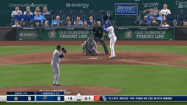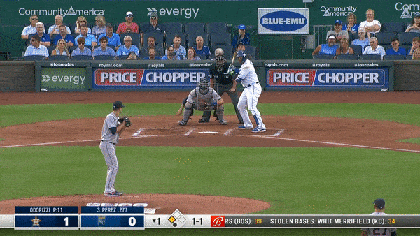That’s Merrifield going on contact, Perez hitting a ground ball at 79 mph and Carlos Correa firing home for the second out of the inning. Perez puts the ball on the ground at a rate of around 38 percent. The Astros infield was in and shifted to the left. The contact play probably wasn’t a smart gamble, but you don’t sacrifice an out if you’re going to stand around, I guess.