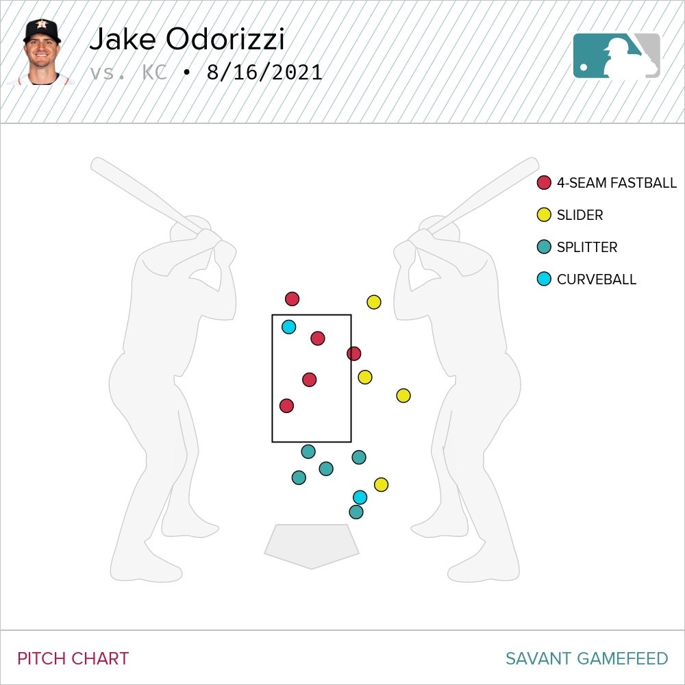 Houston starter Jake Odorizzi was having all kinds of trouble in the first. He couldn’t throw any of his secondary pitches for strikes. The only pitch he could get over the plate was the four-seamer, and he was leaving it dangerously in the middle. Well, it’s only dangerous if the offense isn’t hell-bent on giving up outs.