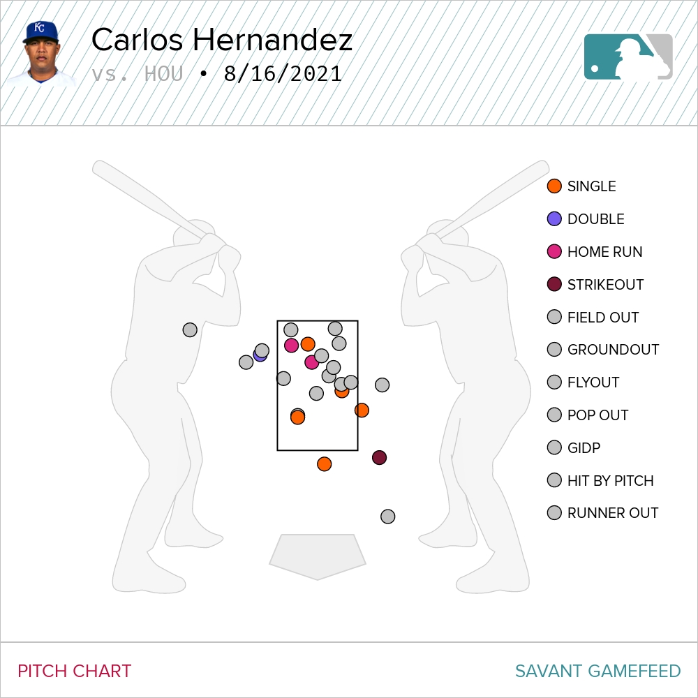 Most tellingly was the fact he got only three swings and misses all night. Two came on his slider and one was on the sinker. Overall, Hernández finished with a 17 percent CSW% (called strikes plus whiffs) which is a really low rate. Astro batters fouled off 10 pitches and put 23 balls in play.