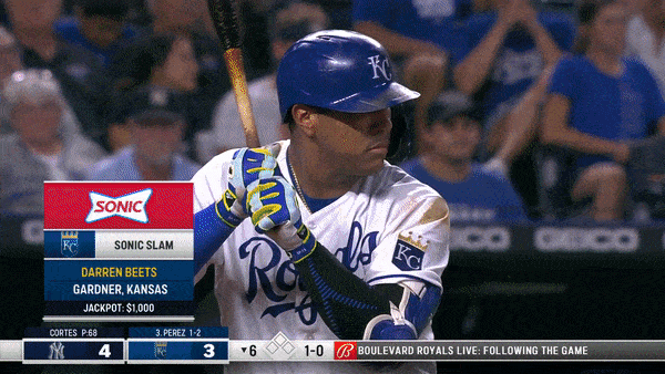 Sal Perez, leading off the sixth inning…The broadcast explaining the ins and outs of the Sonic Slam Inning…Perez cashing in a cool $1,000 for Darren Beets of Gardner, Kansas.