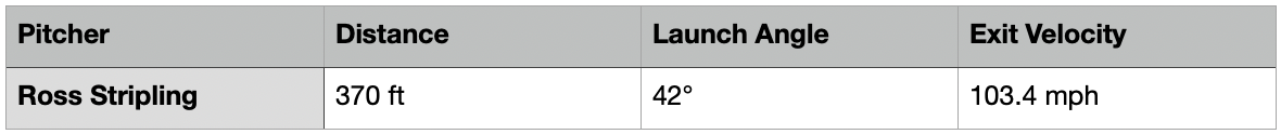 I probably should’ve cut the gif at the moment when the ball leaves the frame. It’s a rocket off the bat, hampered only by the fact the pitch was delivered under 90 mph. You get the feeling watching this that had the pitch come in five to six mph faster, it still would’ve left the yard, but a little more to left-center and at a much higher exit velocity.