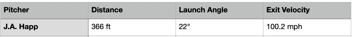 This is like the home run off Happ earlier in the countdown, except it was thrown faster (by three mph) and higher. And in a much more favorable count for the pitcher. Speaking of the pitcher, don’t miss Carlos Rodón’s reaction as the ball continued its flight.