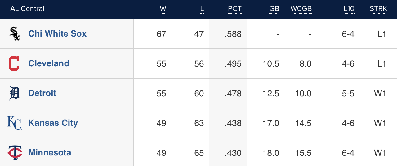 The standings are kind of wild. Cleveland and the Tigers are level at 55 wins, but Detroit is four back in the loss column. The Royals have only three more losses than the Tigers, but they’re level with the Twins on 49 wins. With every team besides the White Sox now under .500, will there be a battle for second place? Oh, the intrigue!