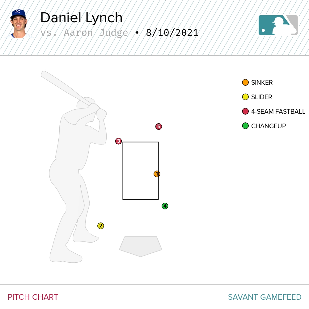 Against Aaron Judge, Lynch caught a couple of corners on a sinker and four-seamer. After setting him up with a low change on 1-2, Lynch climbed the ladder on a 94 mph fastball up and out of the zone.