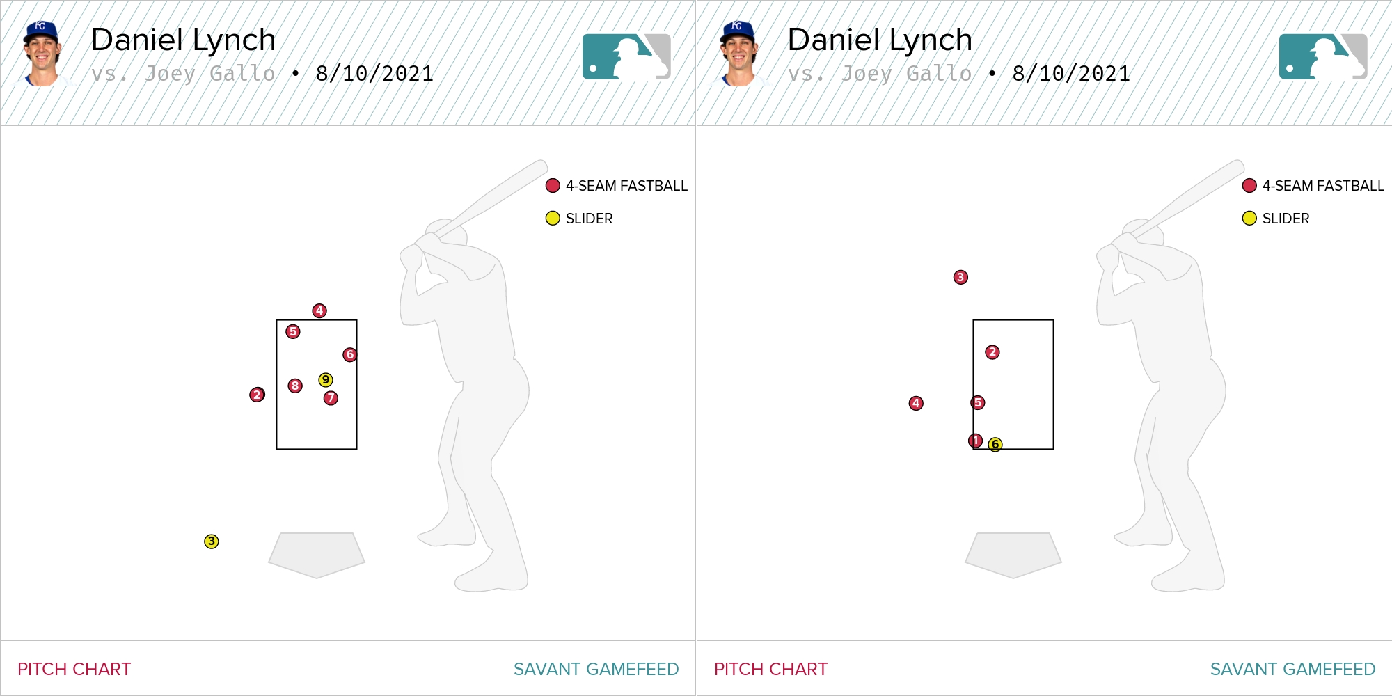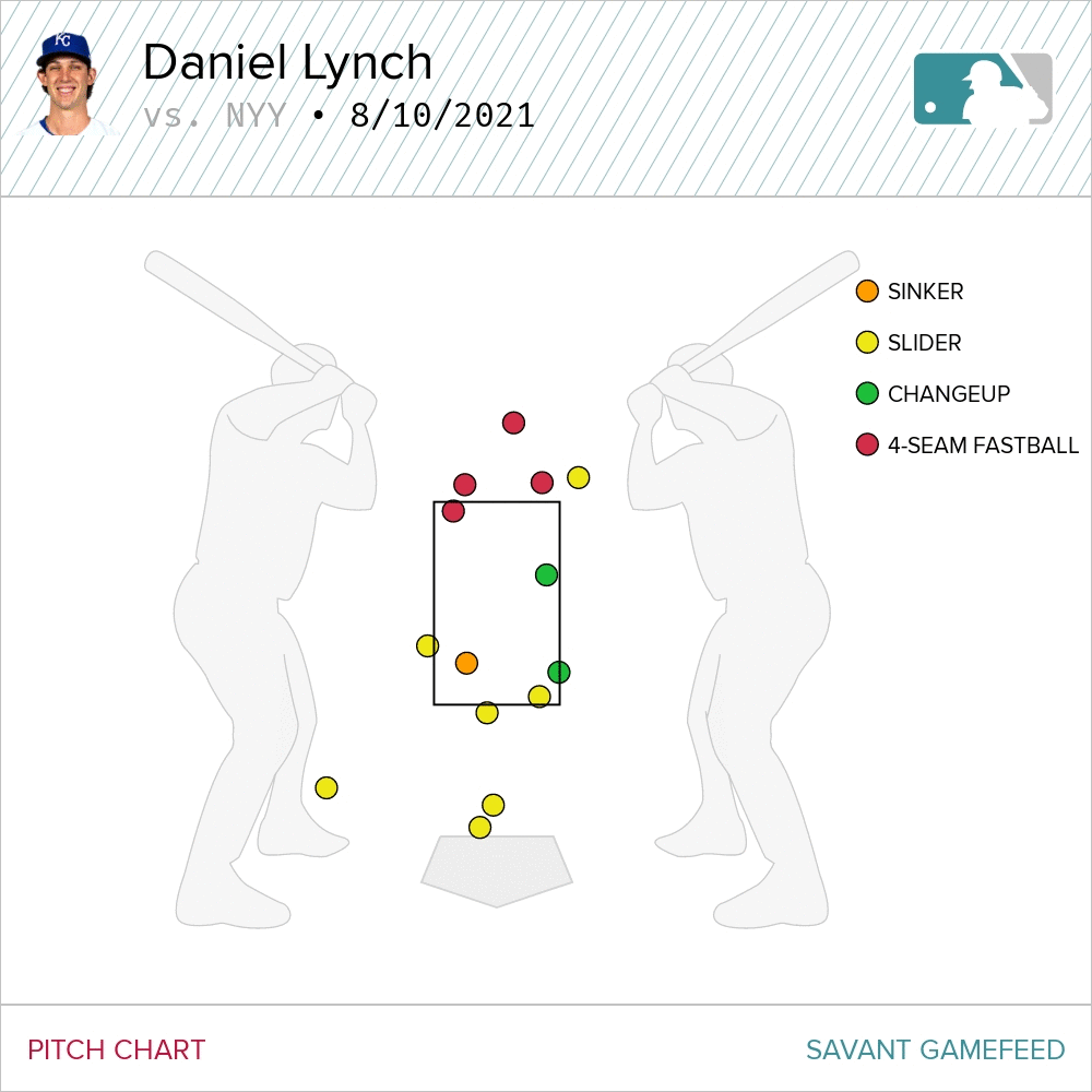 The third inning required 24 more pitches from Lynch. As the Yankees flipped the order through for the second time, LeMahieu stung a lineup 102 mph and Stanton and Judge both singled. But Lynch still owned Gallo. Again, five consecutive four-seamers followed by a slider in a perfect location.