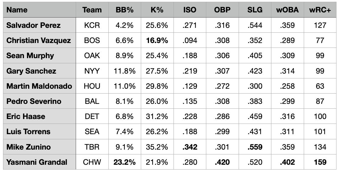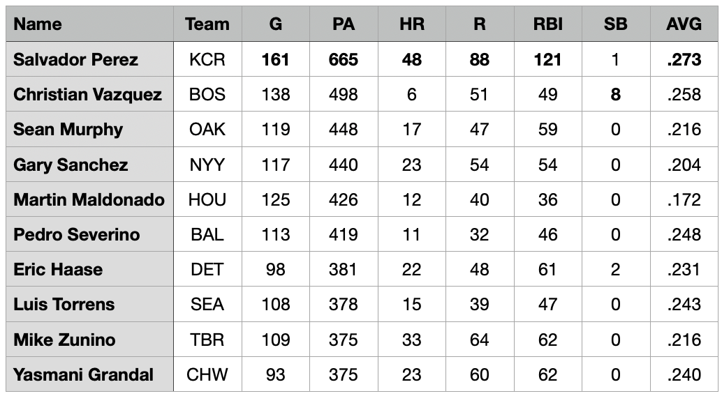 When you visit a site like Fangraphs and run a table like the one above, it defaults to batters who are “qualified.” Meaning those who had enough plate appearances to qualify for the batting title. Here’s the rub: Only one AL catcher had enough plate appearances to qualify. And you know who I’m talking about.